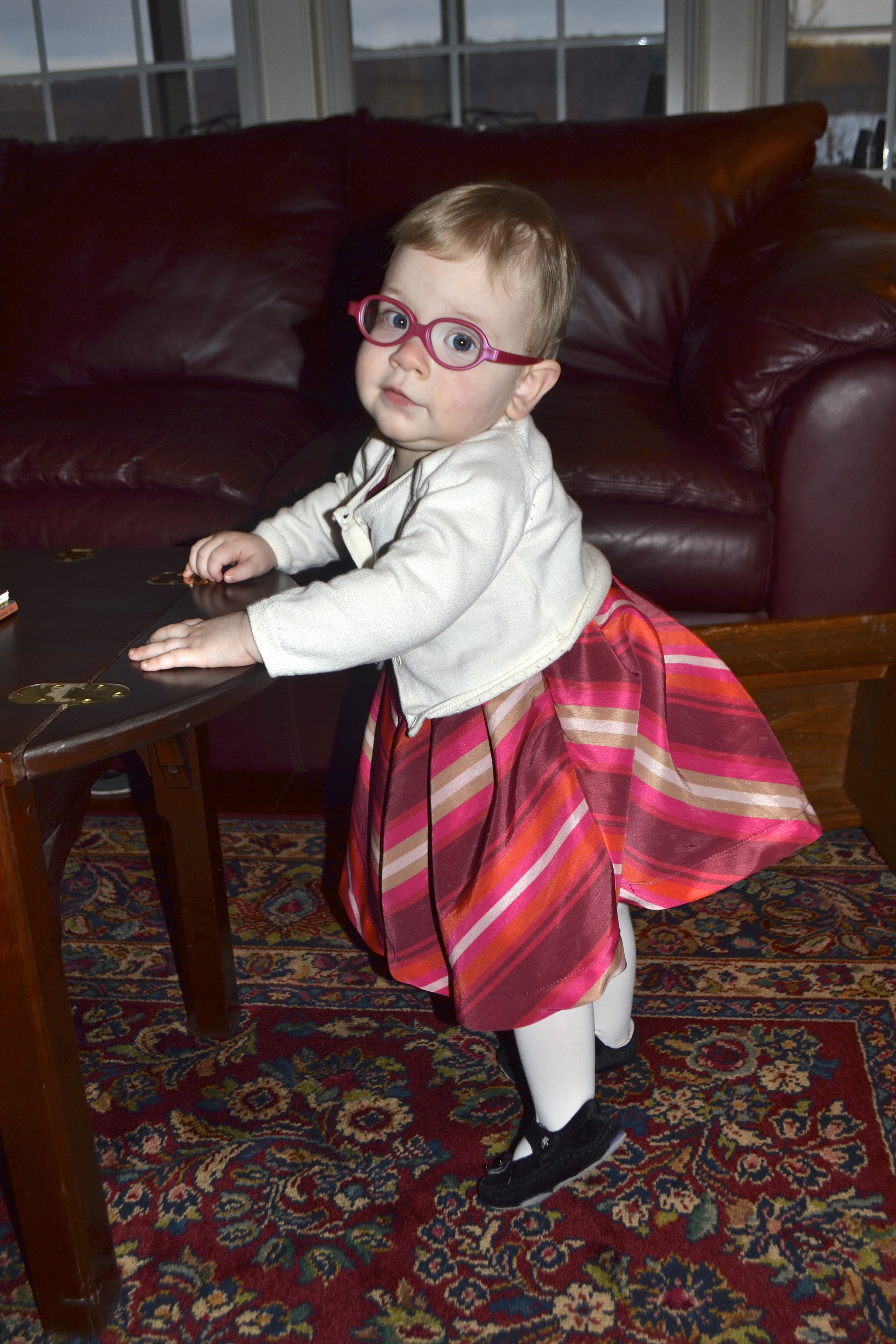 The “burgundy pink” glasses changed her.  For the better.  For a month.  In October, when we got the new glasses, I swore she wouldn’t keep them on, but this time I was committed.  We had no choice.  She had to wear them.  Her right eye was so bad.  I couldn’t give up.  I wouldn’t.  And whatdyaknow!?!  She kept them on!!!  Day one was tough.  But by day two, she kept them on…most of the time.  And a week later, guess what!?!  She pulled to stand.  Yup!  A milestone she gained and lost months ago, came back!!!  And, her mood improved immensely.  She wasn’t back-to-her-old-self, but she was happy (enough).