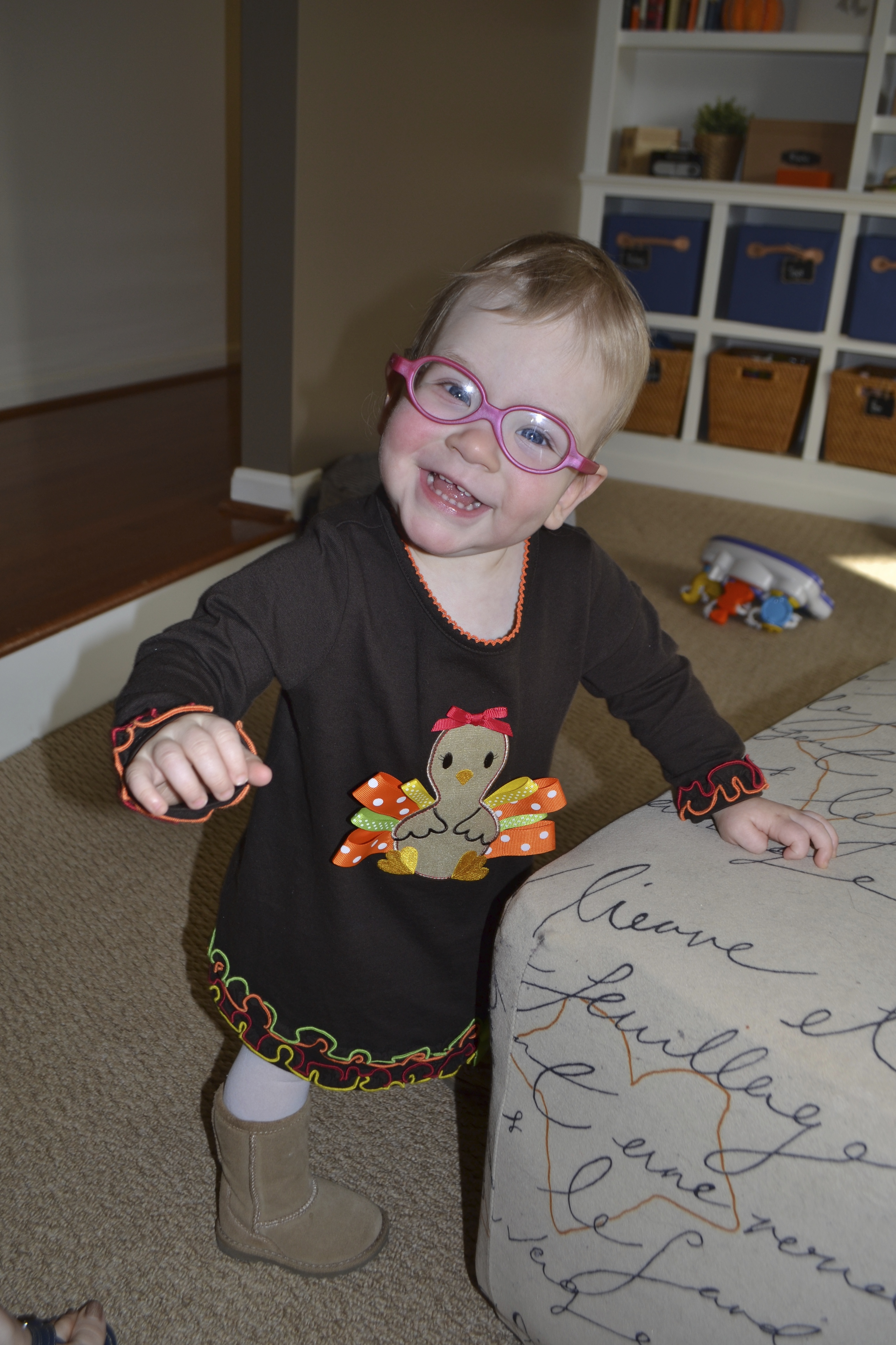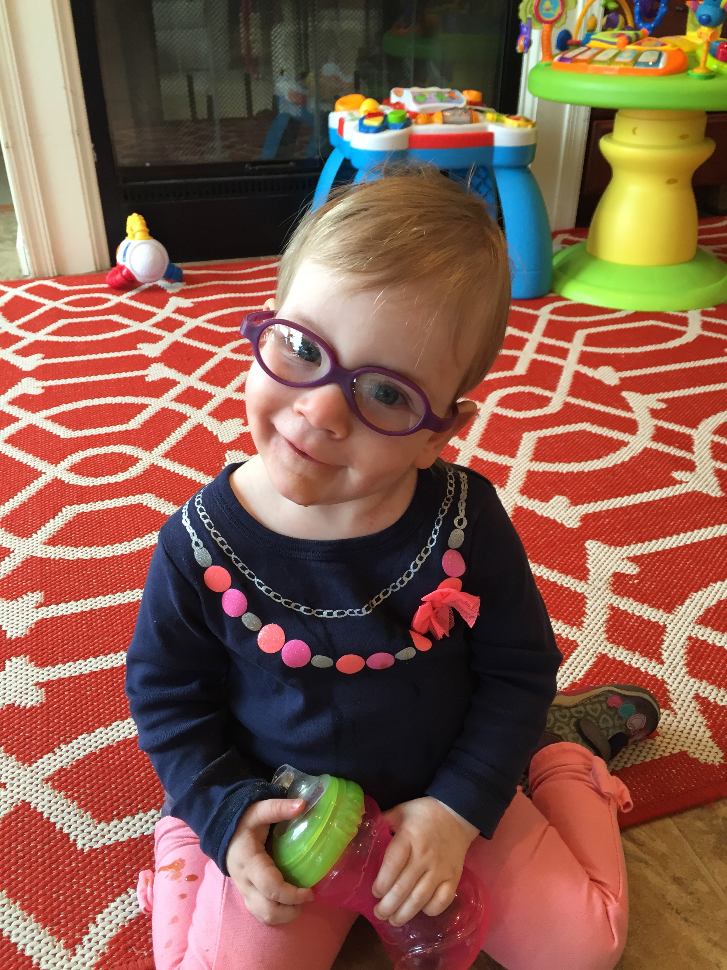 The glasses journey has not been an easy one. You can read more about that here and here, if you haven’t yet. Right now, Miss Thing has been accepting her specs. About three weeks ago, she got a new prescription to help her eyes to work binocularly, instead of using one for distance and one for up-close. Then two weeks ago, her developmental optometrist put some opaque film on the inner corners of glasses. You can see it in the purple frames above, as well. This is to help with any double vision if her eyes do start to converge inward. At first these changes caused Kelsey to take the glasses off a lot more than she had with her previous glasses (after months and months…a year?… of trying to keep them on her for even 2 minutes). But, recently they are staying on for longer stretches, which is reassuring…and one less thing to stress over at the moment.