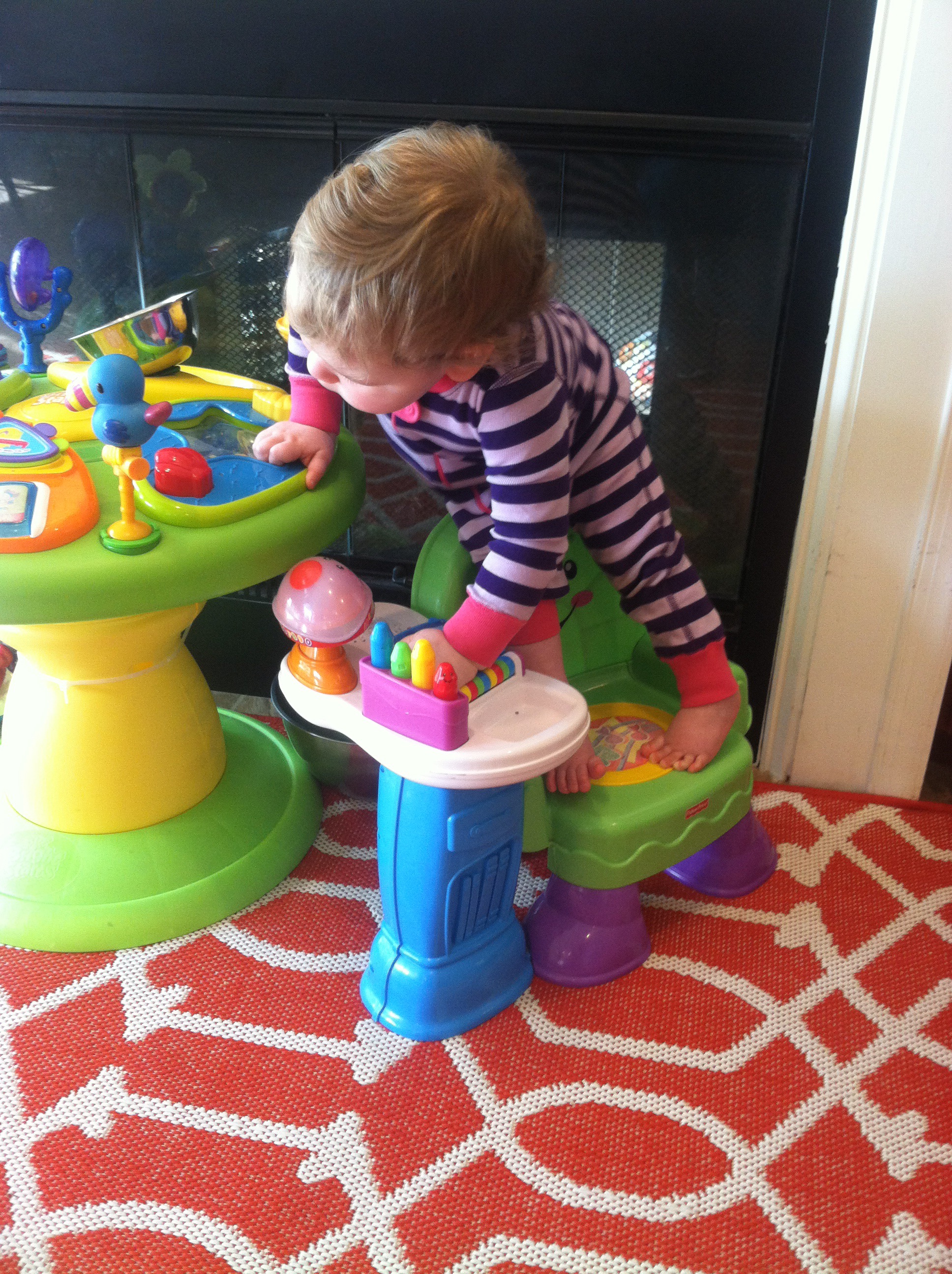 This month we have seen Kelsey start giving kisses again, beginning to wave for the first time, shake her head for no, flirt with strangers in the grocery store, show separation anxiety that she didn’t before, climb stairs on her own, find toys in other rooms on her own, climb precariously up onto toys (see below), and explore and engage in things she didn’t previously. We think we’ve heard a couple of words clearly too!