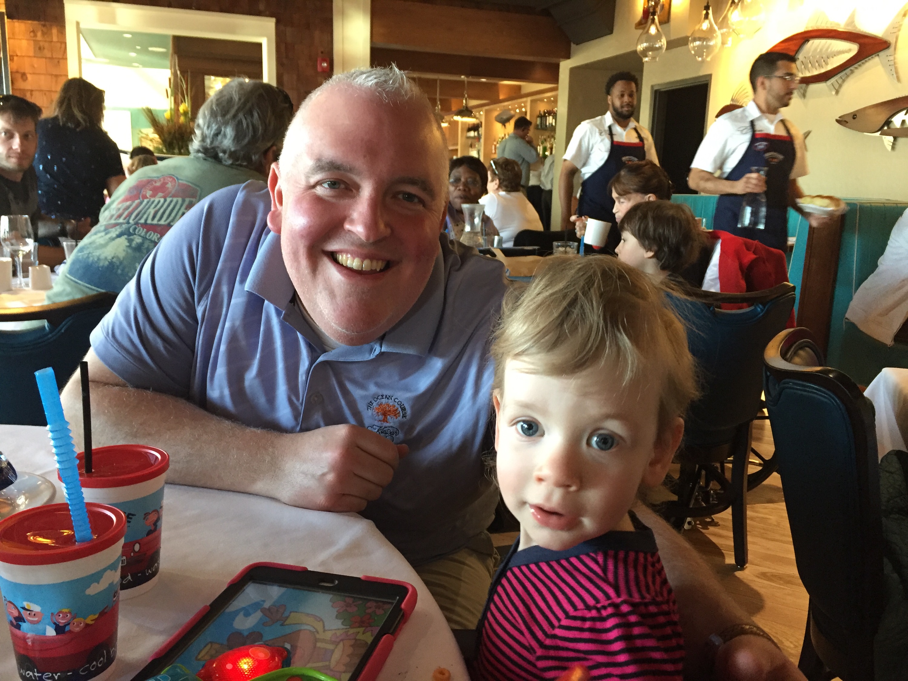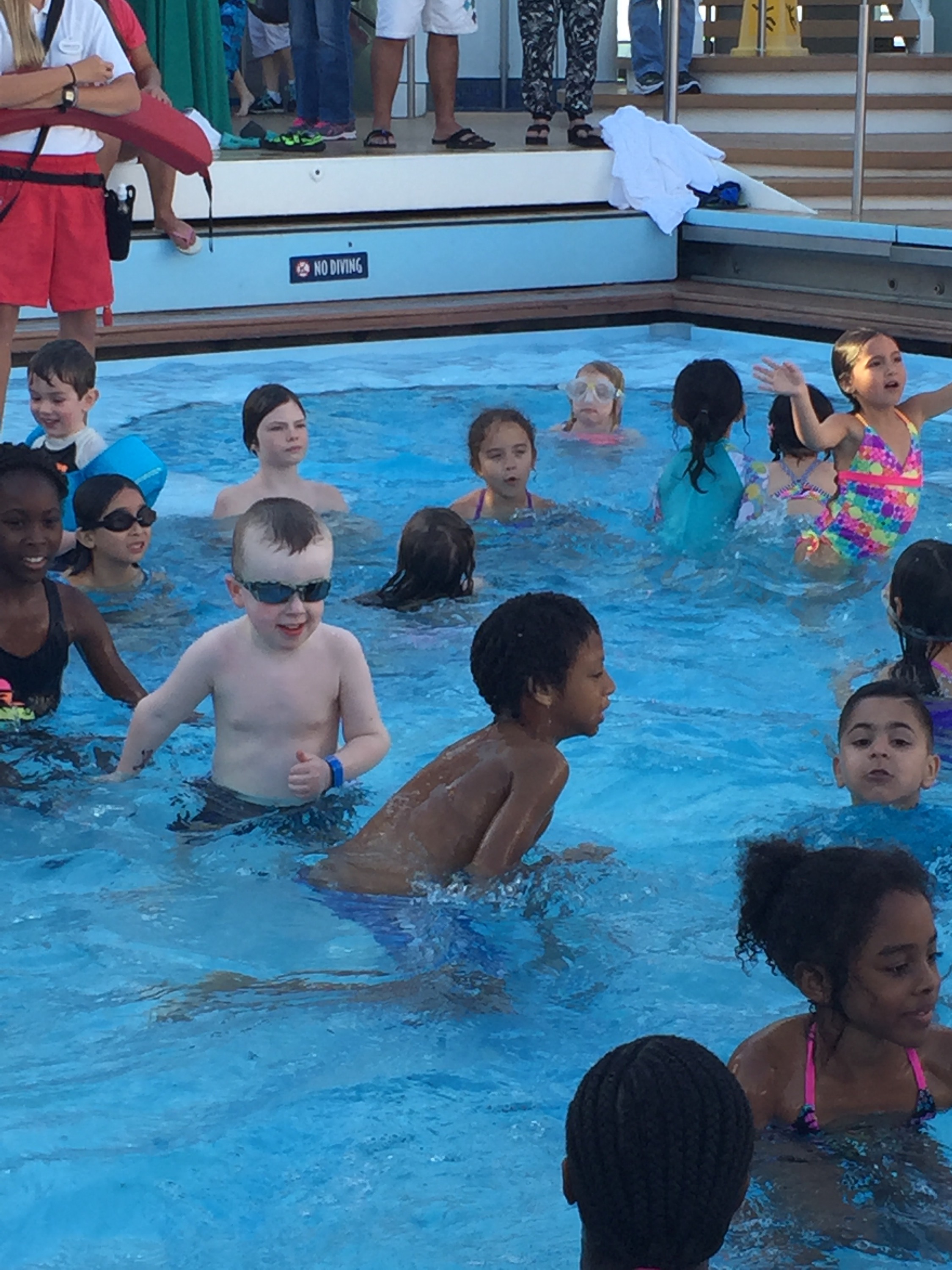 After the AquaDuck, a dip in the pool, and a couple more rounds on the regular water slide, Ben was starting to fade and get cranky. “Woulllld ya want to go to the Kids’ Club????” brought an immediate “YES!” We could barely keep up with him because he couldn’t get there fast enough! And, get this, they feed them! So while Ben went on his way and Kelsey was having a ball (and being fed too!), the adults went up to one of the multiple adults-only decks. Mom-Mom granted us permission to stay up there all afternoon while the kids napped and had fun! Sweet freedom! We lounged, drank, ate, drank some more and counted our blessings.