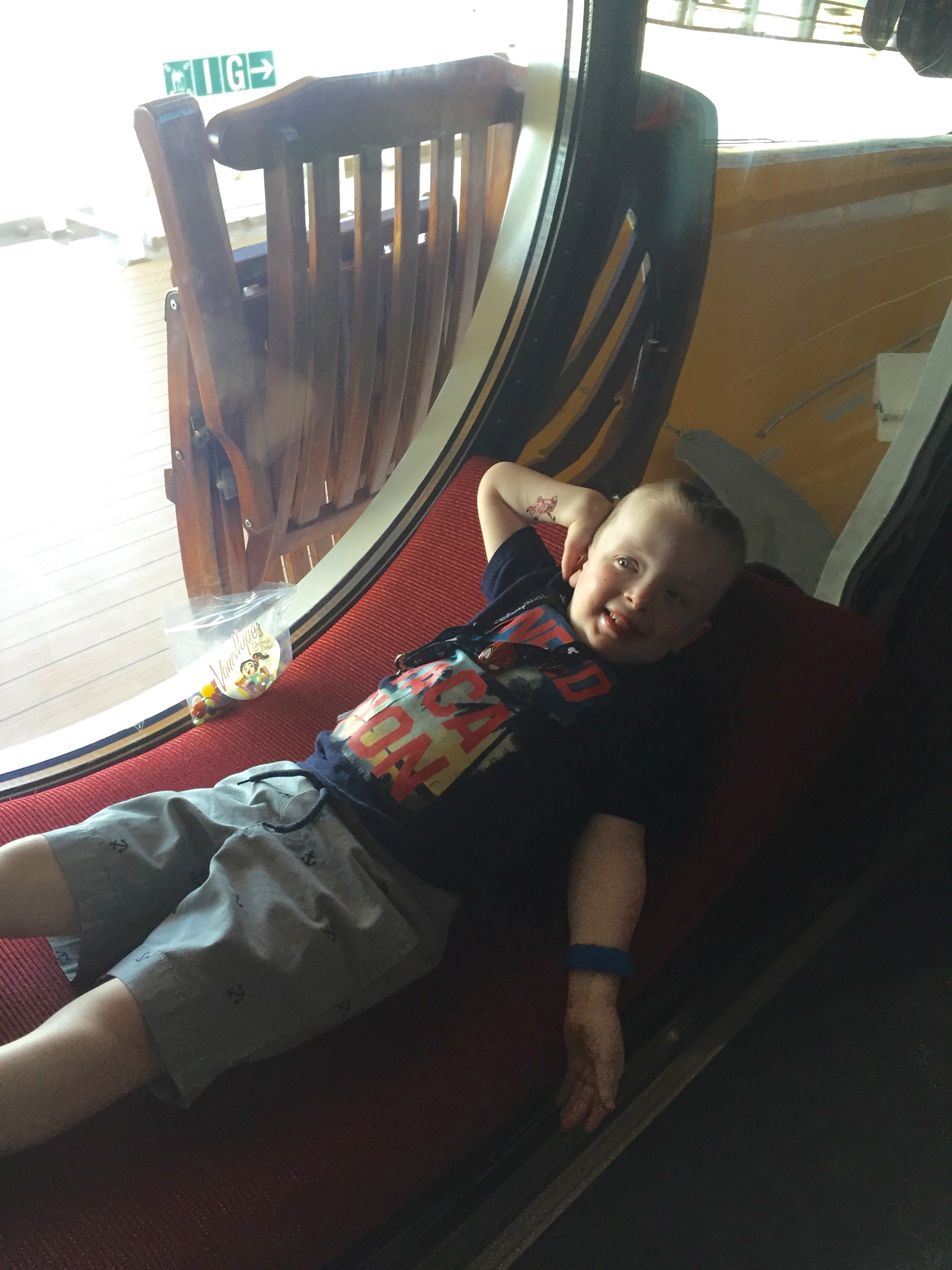 On the morning of Day Five, my mom knocked on our connecting door to tell me Ben was sick and wanted me. He can easily be thrown off by rich foods and an interrupted schedule so I hoped it was that. I was wrong. It quickly became clear that Ben had a stomach virus. His second in two months. On a ship. In a now-what-seemed very small cabin. Because he was sick, we understood that we could no longer go ashore where our ship was now docked–Castaway Cay, Disney’s Private Island in The Bahamas. Insert many tears.